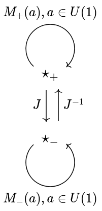 To make the application to phase translation more direct, we will present O(2) using unitary complex numbers. The group has the following elements (closed under group operations): for complex unitary a, meant to represent a phase translation, and J, meant to represent a distinguished mirroring. We have the following algebraic identities: